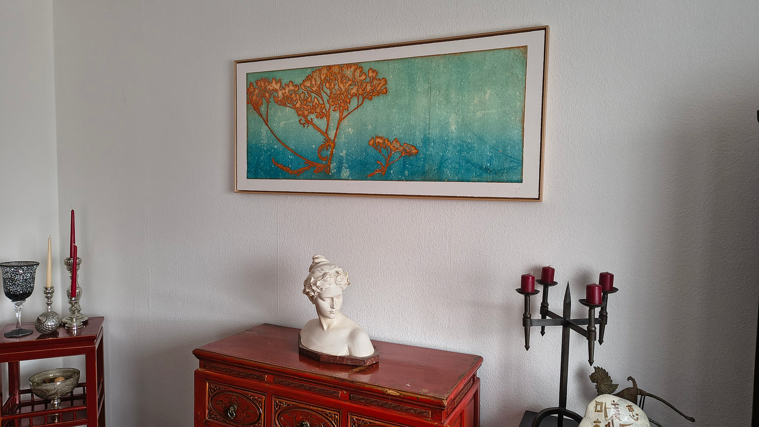 Ich wollte dir längst schreiben, weil unser Nachwuchs völlig fasziniert von deinem Bild ist. Ich habe die ersten drei Monate immer auf der Couch unterhalb von deinem Bild gestillt und der Kleine hat das Bild über drei Monate eingehend (über Stunden!) mit einer Hingabe betrachtet, dass wir gesagt haben, wir werden ihm das Bild später auf jeden Fall schenken.Wir erfreuen uns jeden Tag daran & über die Entscheidung zum Erwerb deiner wunderbaren Arbeit. Da ich immer noch hier im Sessel stille und damit die meiste Zeit des Tages im Wohnzimmer verbringe, sehe ich dein Bild kontinuierlich und ich kann mich weiterhin nicht satt daran sehen. Vielen Dank, dass uns deine Kunst hier tagtäglich begleitet!