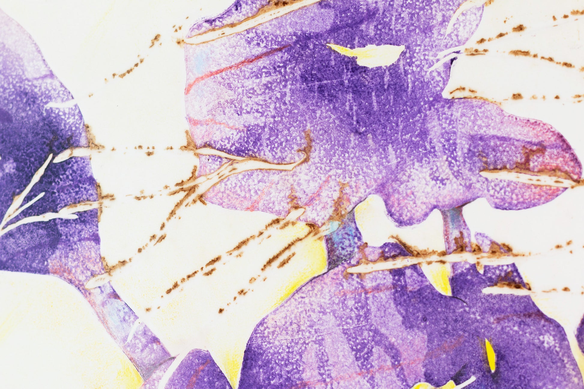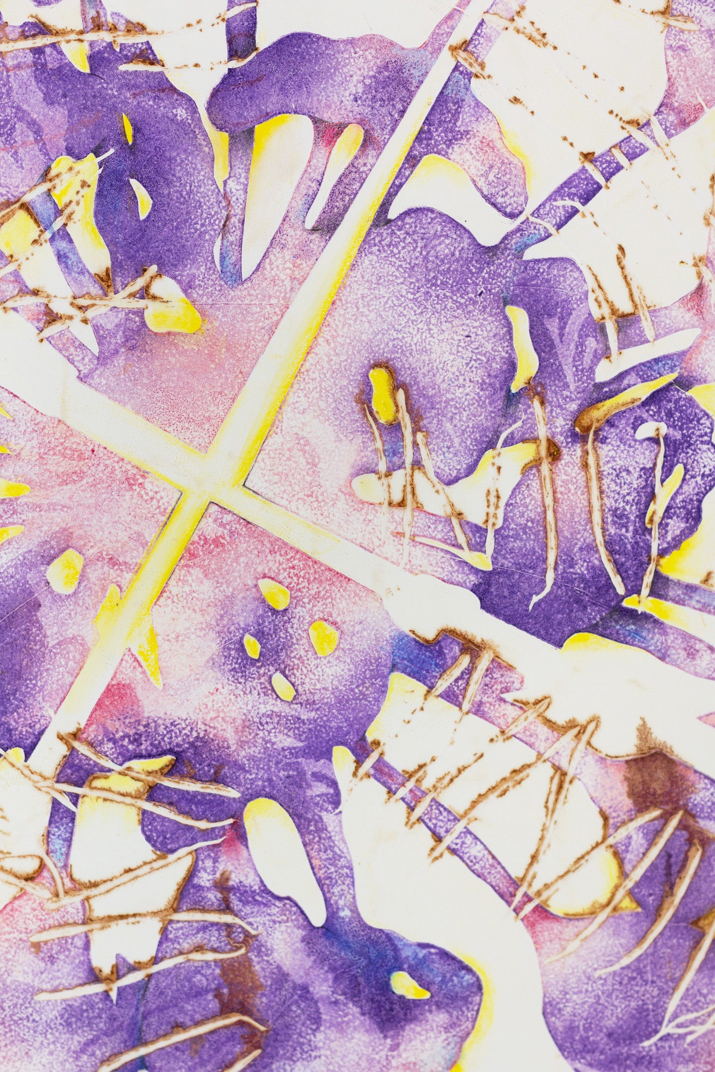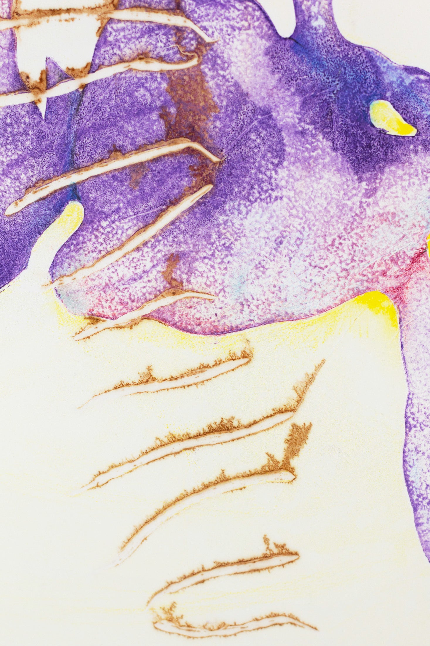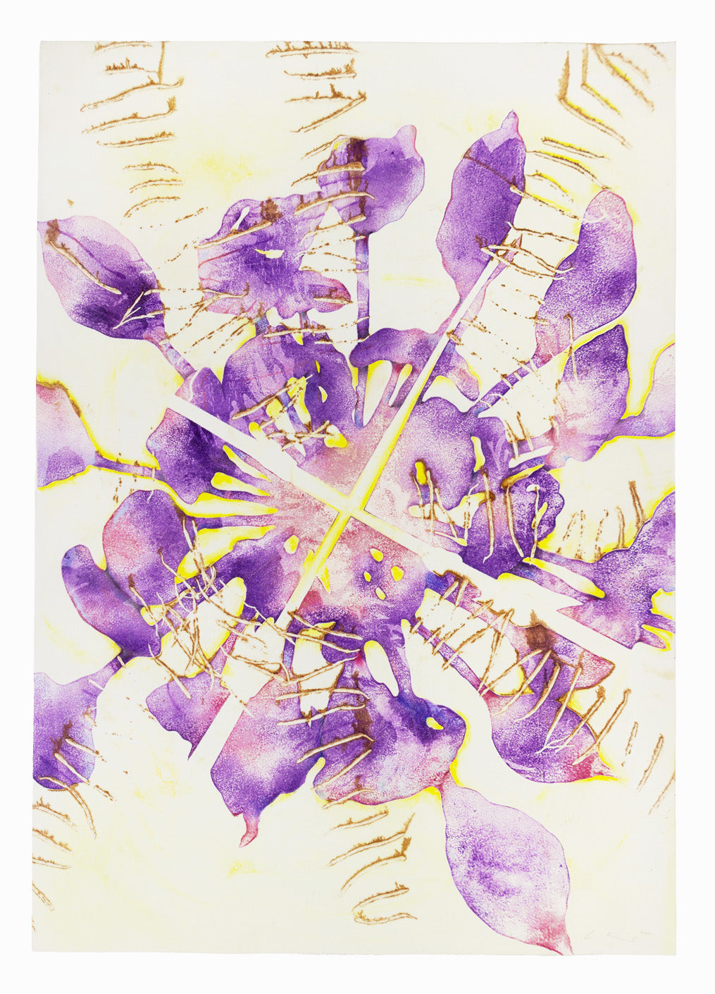 "Auf Sendung", printed with fresh seeds and highly pigmented oil based printing ink on heavy rag paper. The next step involved reworking the print with crayons and wash. It has a warm and radiant impact on the space it lives.