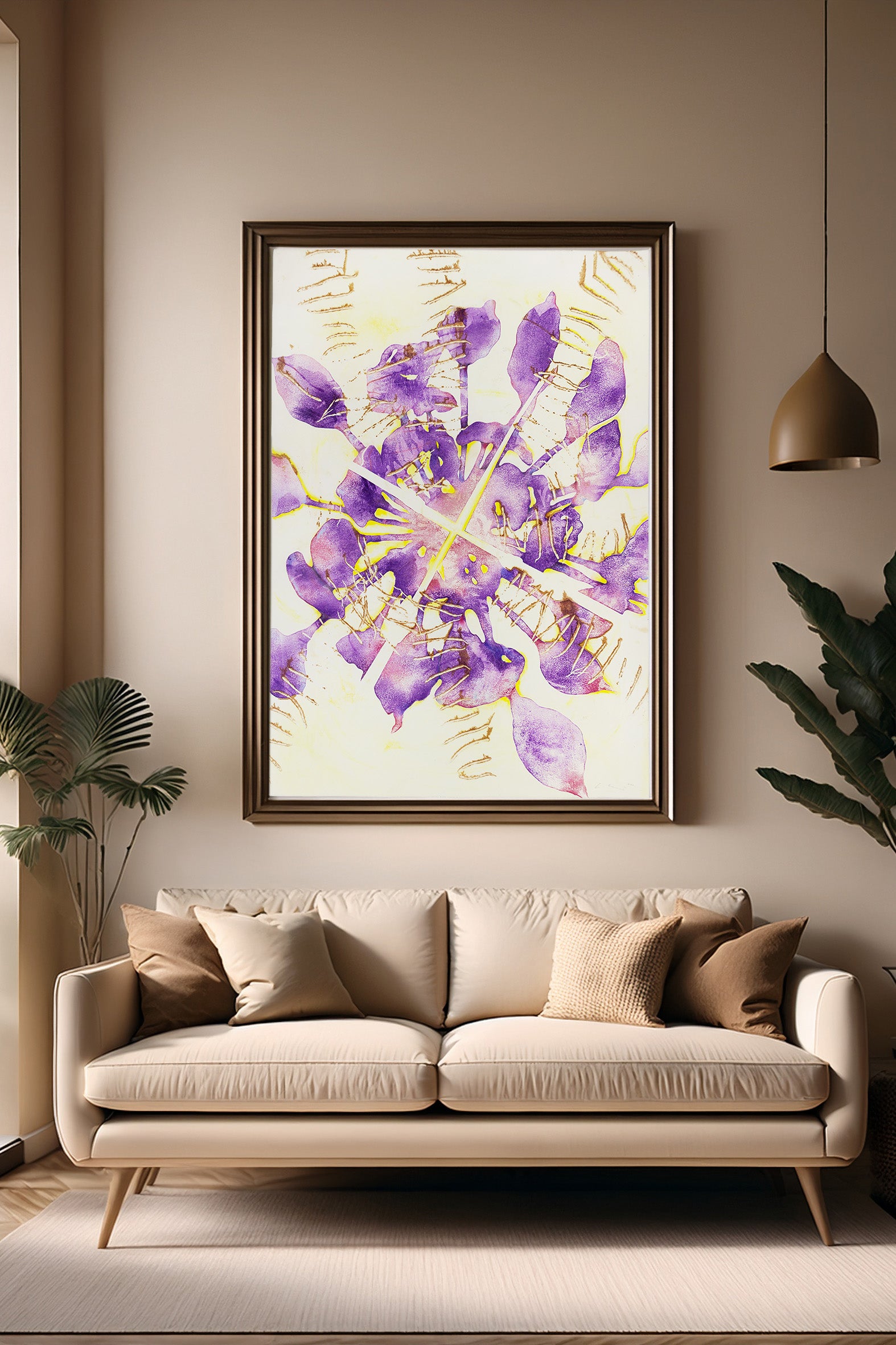 "Auf Sendung", gedruckt mit frischen Samen und hochpigmentierter, ölbasierter Druckfarbe auf schwerem Büttenpapier. Im zweiten Schritt wurde der Druck mit Wachsmalkreiden und Lasuren überarbeitet. Das Werk verleiht dem Raum eine warme und leuchtende Atmosphäre.